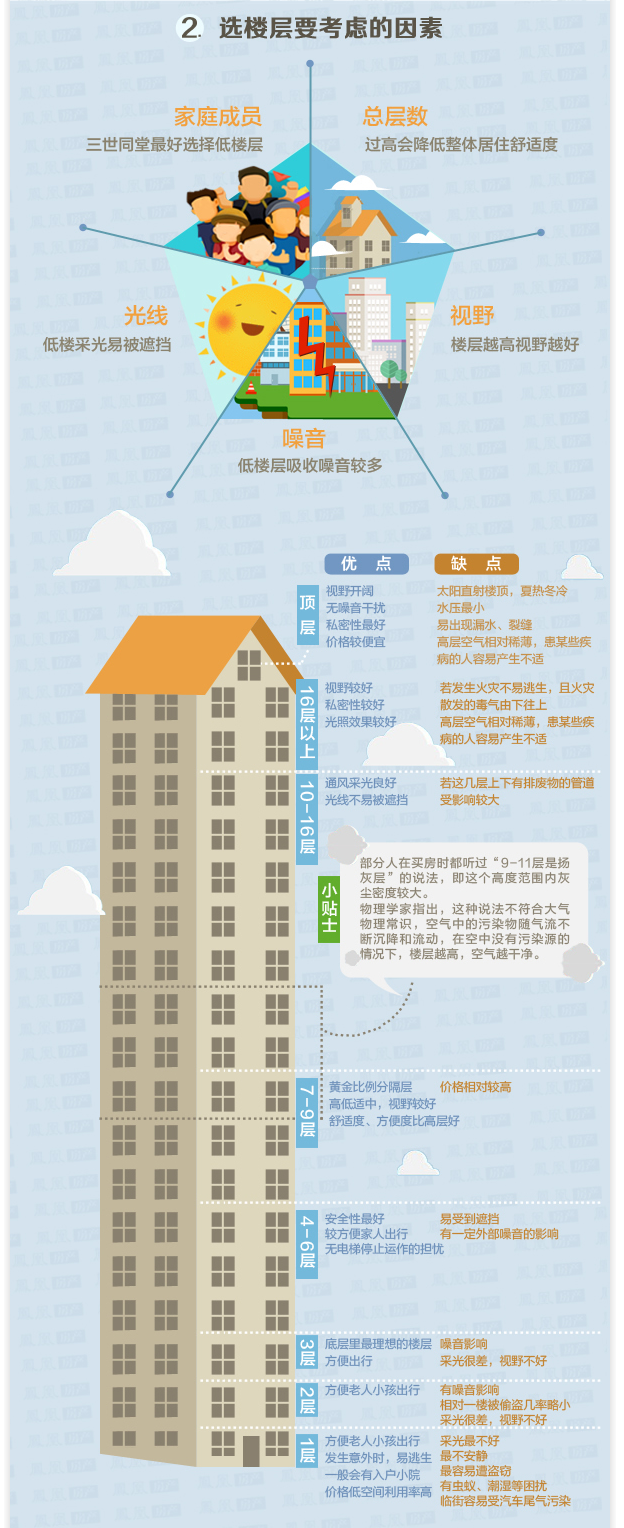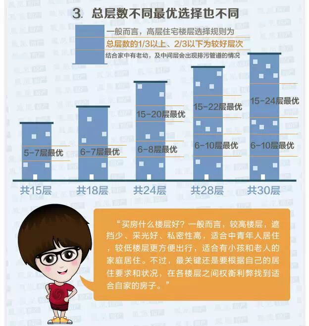 对于高层住宅的选择,很多人都会纠结选哪个楼层,高了怕不方便,低了怕遮光,中间怕扬灰,不需要纠结,一张图告诉你如何选择合适的楼层。